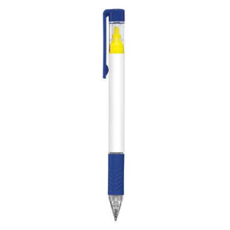 Stylo bille unique, à mécanisme rotatif et surligneur jaune avec grip en caoutchouc et clip assortis.
